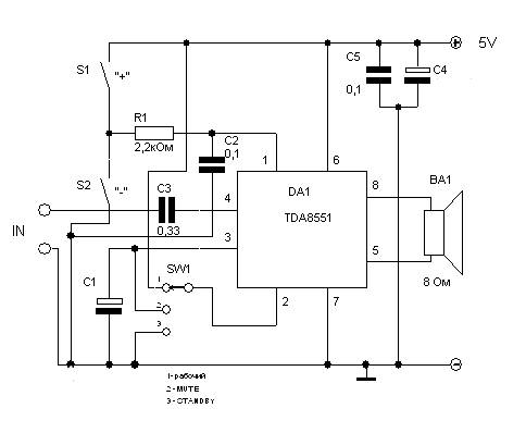 The TDA8551 chip by Philips is a bridge amplifier with output power of 1 watt at a supply voltage of 5V. In this case, current consumption in the silent mode is only 10mA. The chip is made in 8-pin package and requires no heat sink, it can be used in a variety of small devices. Chip is equipped with thermal protection, has an internal delay circuit connecting the load – so that when you turn, you hear a wheeze other wonderful music transients. This chip also built-in an electronic volume control.