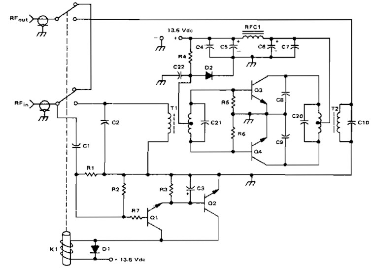 Amateur Radio Linier Amplifier parts list : C1 : 33pF Dipped Mica C2 : 18 pF Dipped Mica C3 : 10 uF 35 Vdc for AM operation, 100 uF 35 Vdc for SSB operation. C4 : .1 uF Erie CS : 10 pF 35 Vdc-Electrolytic C6 : 1 µF Tantalum C7 : .001 pF Erie Disc C8, 9 : 330 pF Dipped Mica R1 : 100 k ohm 1/4 W Resistor R2, 3 : 10 k ohm 1/4 W Resistor R4 : 33 k ohm 5W Wire Wound Resistor R5, 6 : 10 ohm 1/2 W Resistor R7 : 100 S2 1/4 W Resistor RFC1 : 9 Ferroxcube Beads on #18 AWG Wire D1 : 1N4001 Q2 : 1N4997 Q1, Q2 : 2N4401 Q3, 4 : MRF454 T1, T2 :16:1 Transformers C20 : 910 pF Dipped Mica C21 : 1100 pF Dipped Mica C10 : 24 pF-Dipped Mica C22 : 500 µF 3 Vdc Electrolytic K1 : Potter & Brumfield KT11A : 12 Vdc Relay or Equivalent