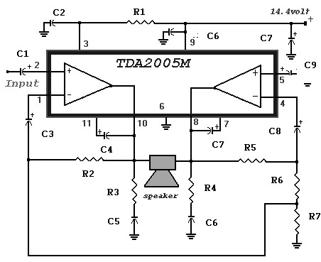 This 20 Watt Power Amplifier circuit is used as a car audio amplifier. Its main component is 20W Bridge Amplifier For Car Radio TDA2005 IC.