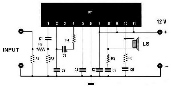 The input IN is connected to the output of the receiver, U output is connected to the speaker as shown on car audio amplifier scheme. It is very important to ensure that the speaker has no connection tothe chassis (ground) if not, the integrated circuit IC1, a TDA 2004 will soon be damaged. For mounting, carefully follow the implementation of the car audio amplifier scheme for the components. The power supply will keep with 12 volts.