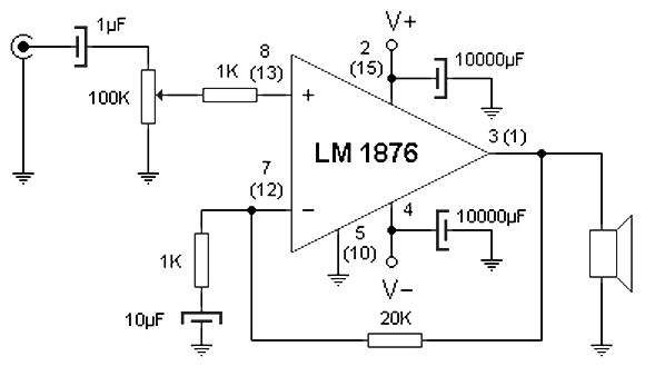 In the 20 watt stereo amplifier circuit observed only one stage of the system because the circuit stereo, second channel are identical. The figures in parentheses are equivalent to the terminal for second channel. The core of this project is the integrated circuits from National Semiconductor, the LM1876, which provides two power operational amplifier with mute and standby function.