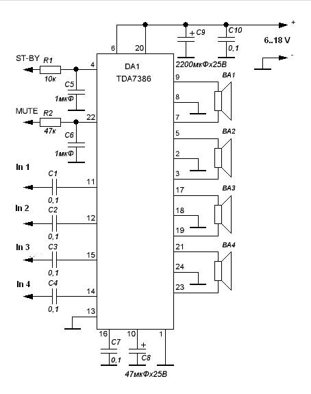 LF power amplifier built on a chip TDA7386. This is a simple power amplifier which very easy to assemble, but at the same time having good characteristics quad amplifier. It’s possible to use this circuit for surround sound system.