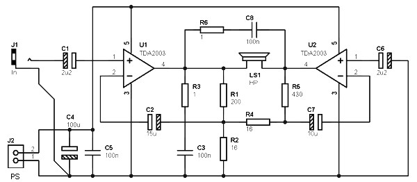 This bridge power amplifier, without great pretensions, is simple to perform, and works with a single power supply of 18 V. It is based on the use of two amplifiers type TDA2003, capable alone to deliver a power of about 10 W (10% distortion, limited to 7.5 W at 0.15% distortion) .
