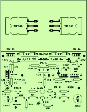 The current amplifier comprises two complementary pairs Darlington, armed around the BD139 and BD140 + + TIP33C TIP34C known, I have been given ample proof of strength and loyalty. To stabilize the quiescent current of the output transistors I use the simple but effective method of anchoring the base bias using 4 diodes 1N4007. Note that the diodes are on the edge of the sink output, that is to have thermal contact with it, because if heated output stage voltage decreases joint, doing the same quiescent current. It is fixed by means of preset about 500 ohms at 10mA, measured by placing a scale tester with a 200 millivolt peak in the speaker output and the other at one end of one of the emitter resistors 0,47 ohm 5 Watt. You should turn the preset to have a reading of 5 mV or so.
