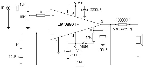 The audio signal from the sound card enters the operational amplifier by pin 10 (non-inverting input). A 1μF capacitor passes only the audio signal, blocking the DC component that may exist. A 10K potentiometer (optional) lets you adjust the input limit. At the output a 20K resistor performs the feedback through the inverting input while a set RL power output coupled to the speaker. This set consists of a coil of 10 to 15 turns of wire 1.5mm on a resistance of 10 ohms / 2 watt. Two electrolytic decouple the power supply and a jumper controls the mute (silence) which is activated by opening the switch. The 100μF capacitor with the 47K resistor act as input delay, avoiding noise when connecting the power.