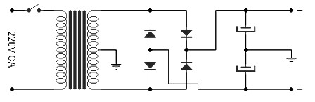 Diodes are 100V / 8A and can be replaced by a bridge rectifier. Electrolytic capacitors are 10000μF / 50V. The transformer is 220V in his primary and secondary 50V at its midpoint and current 6A for a quad configuration.