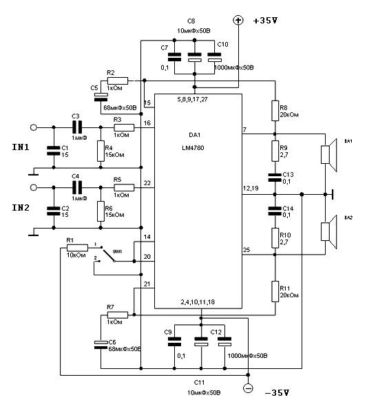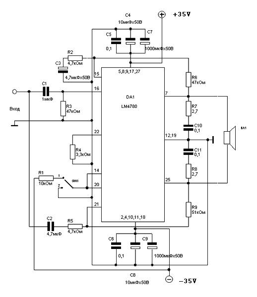 In the chip implements two identical channels of amplification and specifications are for the stereo mode of the amplifier. Chip can also operate in mono – in bridged mode. In this case, the output power at CG = 0.5% at 120 watts. The other characteristics remain practically unchanged.
