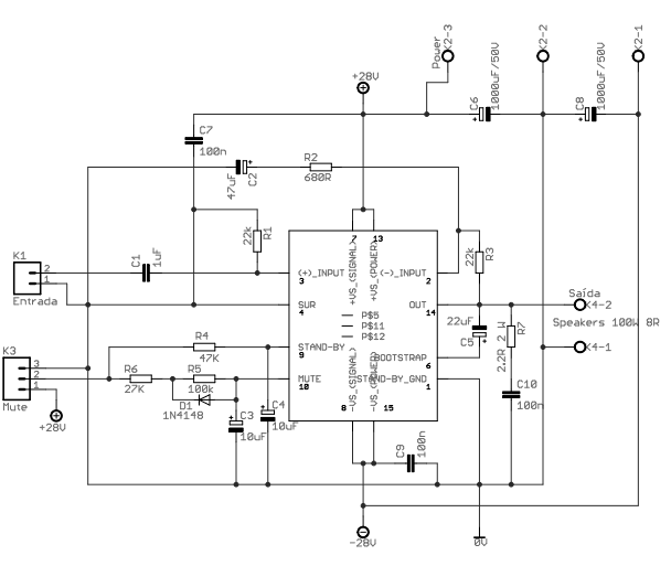 Power Amplifier based tda7294 from ST microeletronics, you can gain power up to 100W in a single chip, for stereo unit, use similar two circuits. This circuit is based on the manufacturer’s datasheet for tda7294 typical application usage. Amplifier is ready to work with a powerful signal source, if necessary, use an opamp pre-amplifier.