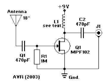 L1 can be chosen for the application. A 470µH coil works on lower frequencies and lie in Am, for shortwave try a 20µH coil. This AM/FM/SW Active Antenna circuit can be powered by a 9 volt battery pack. If a power supply is used, bypass the power supply using a 0.04µF capacitor to prevent noise pickup. The antenna used on this circuit is a standard 18-inch telescoping type, but a thick piece of copper, bus-bar, or piano wire will also work fine.