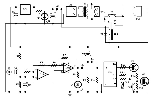 Pressing the P1 circuit is switched on and supplies power to any device connected to the outlet SK1. The input signal is amplified and limited by IC2A and IC2B, and controlled light-emitting diode D4. In the flash of the LED D4, even very short, chip IC3 is reset and restarts its counting. At the conclusion 2 IC3 remains low, the transistors are opened and the relay is on. If within 15 minutes of input was not, ends up by chip IC3, and the output 2 is set high. Q1 and Q2 are closed, and relay switches off. Accordingly, the device connected to SK1, are disconnected from the network. The chain of C5 and R9 is used to reset the counter IC3 initial power-on. P2 button at any time to disable the device manually.