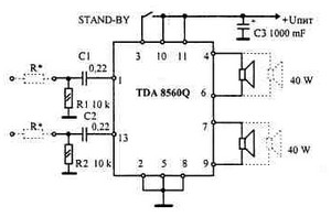 It is obvious that this feature is the ability TDA8560-operate on two pairs of 4 * Ohm speaker can announce one-chip whole interior of the car – a pair of speakers in the doors, a couple on the back of a shelf – and all this with the total capacity – 80 W!