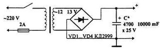 In the case of an car amplifier in the home power supply should have the recommended settings, the transformer with overall capacity of 80 100 W, the secondary winding – for a current to 4 A (Rl = 4 Ohm) or 7.5 A (Rl = 2 ohms) * C – the more the better (ideally 47 000 mF)