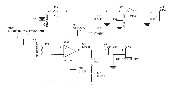 The compact power amplifier chip LM386 is perfect if the whole scheme powered from the battery.This circuit can be used as an amplifier for portable speakers because of its small and compact.