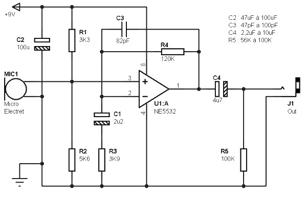 The op amp provides an amplification of about 30 dB (which is sufficient for the relatively high output level of an electret microphone), this gain depends on the value of resistors R3 and R4. If you want to be able to vary the gain, simply replace the resistor R4 to 120K a 470K potentiometer in series with a resistance of 10K. The overall gain in this way can vary from 10 to 45 dB.