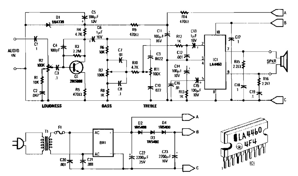 The 5 W audio amplifier circuit consists of loudness control, driver amplifier Q1, and the bass and treble controls of approximately ± 10 dB boost / cut. Either the ac supply shown in here can be used, or a 12 Vdc supply can be connected to points A&B (positive) and C (negative). Two of these circuits, using ganged potentiometers at R2, R7, and R11 can be used for stereo applications. T1 is a 12Volt 1 ampere plug-in transformer. Notice that IC1 must be heatsinked. Power output is about 5 W. A 4″ x 2″ x 0.050″ aluminum heatsink should be adequate.