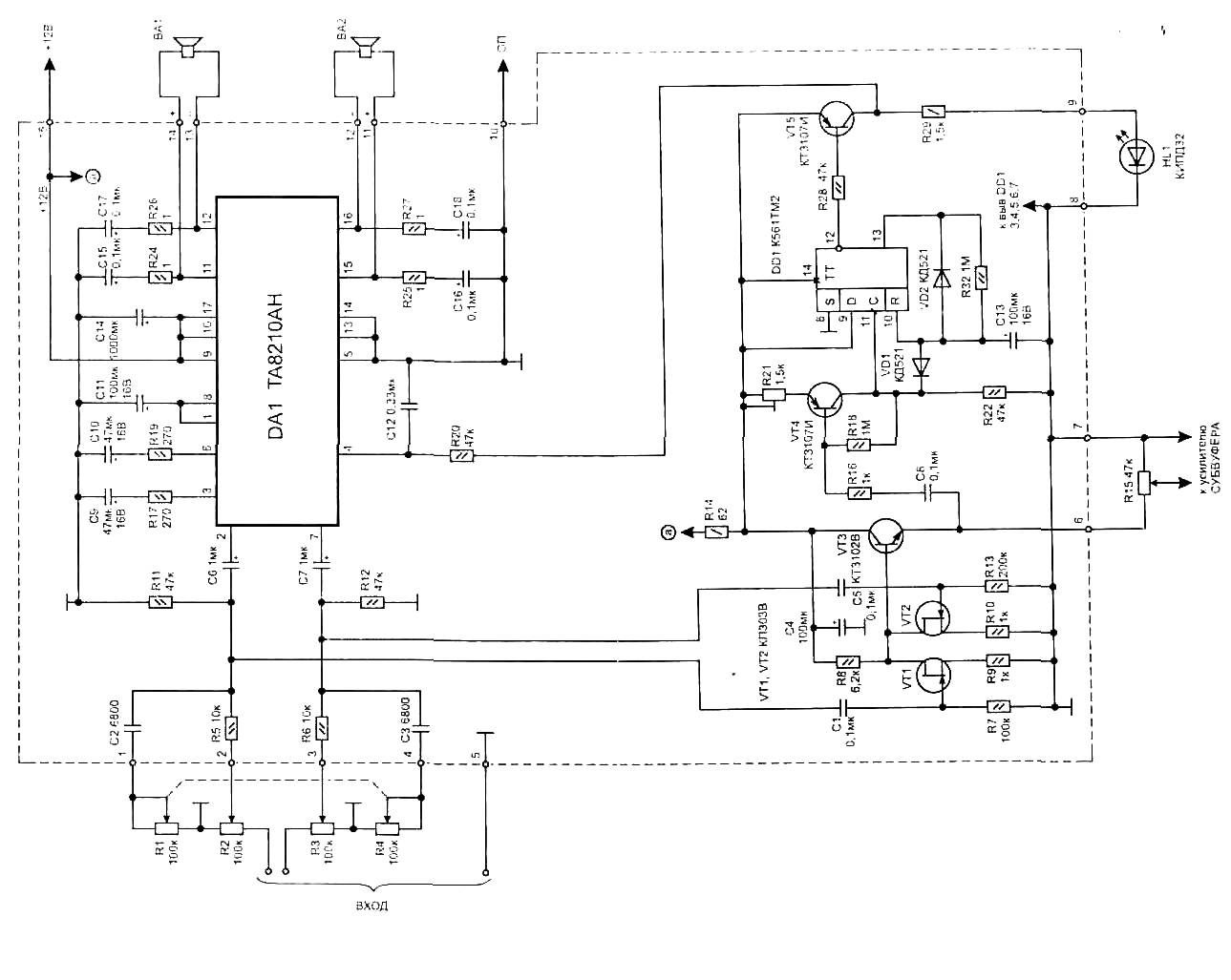 The electrical circuit of the amplifier is shown in Fig. 1. For its production is chosen in a typical IC TA8205AN inclusion. Usually it is applied to a Hi-Fi class due to low harmonic distortion. Suitable as a similar but more powerful: TA8210AN TA8215AN and (wiring diagram in this case does not change).