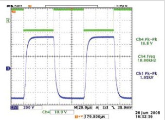 Above shows the response to the scheme on a square wave of 10 kHz. The signal has no distortion at the top of the pulse and the front and rear edges are virtually identical. Below pic shown on the scheme in response to sine wave frequency of 20 kHz. Signal in both figures has an amplitude of 1 kV.