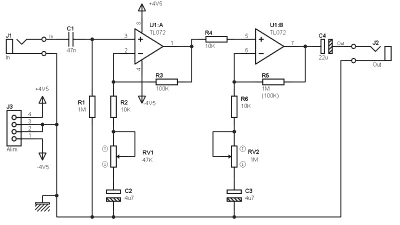 This simple pre amp based TL 072 circuit is certainly not the best, it doesn’t even have tone controls. But has the advantage of being simple to build and also have benefits from a very low cost.
