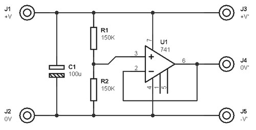The supply voltage must be a symmetrical, two batteries of 4.5 V or 9V battery is enough. You can also use a single supply of between 9 V and 24 V, associated with a symmetrizer power such as that seen in the following diagram: