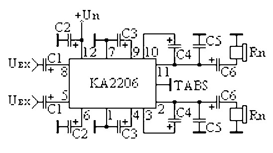 Parts list : C1 : 1uF C2, C3, C4 : 100uF C5 : 0.1uF C6 : 470uF IC : KA2206