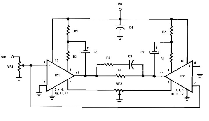 This Low voltage bridge audio amplifier circuit is for low voltage applications requiring high power outputs. Output power levels of 1.0 W into 4 ohm from 6 V-and 3.5 W into 8 ohm from 12 V are typical. Coupling capacitors are not necessary since the output dc levels will-be within a few tenths of a volt of each other. Where critical matching is required the 500 K potentiometer is added and adjusted for zero dc current flow through the load.