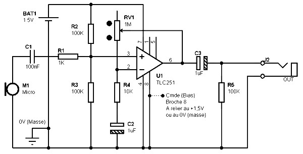 Mic Preamplifier described here is designed for dynamic type microphones, the impedance between 200 ohms and 1 ohm. Its uniqueness lies in the low power consumption, no more than 30 uA in the “worst” case, and make it very portable for this, powered by 1.5 V battery which will allow for longer operating time. This scheme is based on records from the Texas Instruments application.