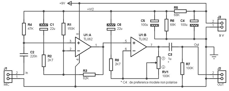 This circuit is perfect pre-amp to amplify the signal from a mono microphone. It is based on the use of a type integrated circuit TL062, a little less known perhaps as the TL082 or TL072 often used by maniacs audio.