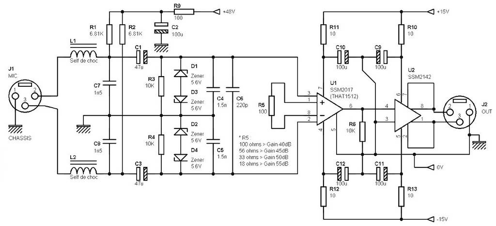 This circuit is a mono preamp for use with a dynamic microphone or electrostatic. It has a phantom power and use a balanced input for the SSM2017 and SSM2142 for the symmetrization of the output.