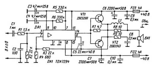 Monoblock Car Amplifier circuit TDA7294 is based on an article “Improving the power amplifier IC TDA7294” Journal of the radio, № 11 2005. This mono car amplifier has a sufficiently high reliability, high capacity, high-quality bass. Monoblock Car Amplifier circuit is shown above. The difference from the original circuit only in the output transistor using a better replacement.