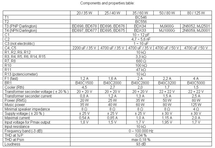 The first thing you should do, is to measure the end transistors (T3 and T4) amplifying coefficient, the hfe or â. If bigger than 30 %, the amplifier would not give a clean sound. You can used MJ3001 and MJ2501 transistors, and this amplifying coefficient was around 5%.