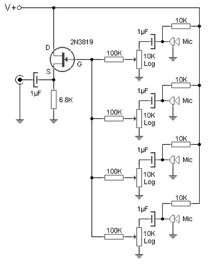 We can say that this Multidirectional microphone circuit consists one side of electret four modules, each of them provide power to the capsule through 10K resistor, DC blocked through 1μF capacitor and the resulting AF signal is received at the end of the potentiometer which serves as a reception setting. 100K resistors and transistors form a network FET preamp and summing several signals, which can be applied without any problems on the line input as the microphone channel of the console.