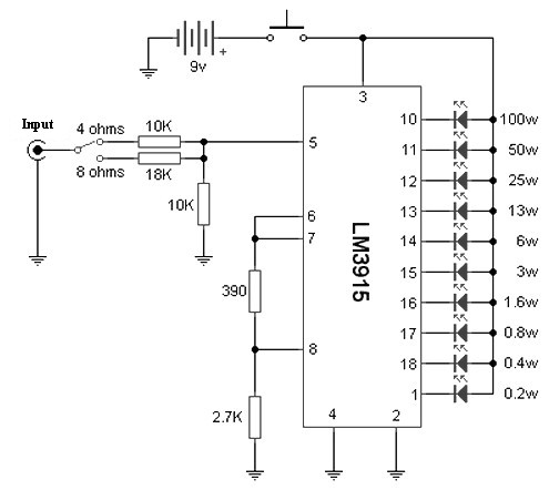 As shown in the Sound level meter schematic diagram of the entire system is in the integrated circuit LM3915, and beyond that there are only a a few passive components. Because the impedance of the speaker in which the measurements were made affecting the outcome, and therefore provided a button to select the load impedance, it may be 4 or 8 ohm.