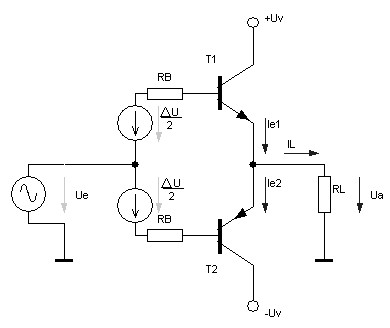 This push-pull on the complementary transistors. As can be seen in the base circuit of transistors integrated voltage sources forming the initial displacement of the working point of each of the transistors. So just the magnitude of this voltage depends on which mode (class) would work or that the output stage.
