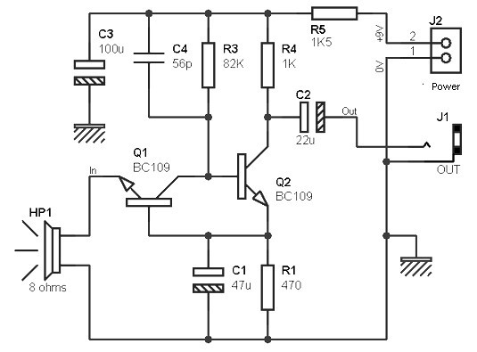 The previous Preamp for the speakers as a microphone installation is indeed simple, but has virtually no gain. It is quite possible to add a second transistor to fill the gap, as shown in above diagram.