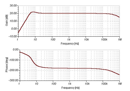 The second stage, built around Q2 is direct coupled, this minimizes phase shift effects (introduced with capacitive and inductive coupling methods) and acheives a flat output response from 20Hz to over 100kHz. The frequency response measured across a 10k load resistor is plotted below simulated using a 12V power source: