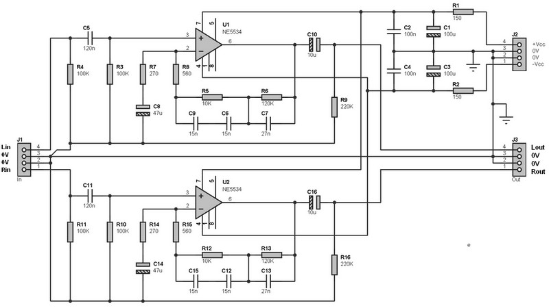 Here the RIAA stereo preamplifier classic version based on NE5534. This setting is intended for use with a vinyl turntable equipped with an analog output (RCA). It provides the dual function of pre-amplification and RIAA correction. This RIAA pre amp circuit is suitable for MM cells (Moving Magnet), and is not suitable for cell MC (Moving Coil). It is slightly more efficient than “RIAA stereo preamplifier classic version, based on the NE5532”.