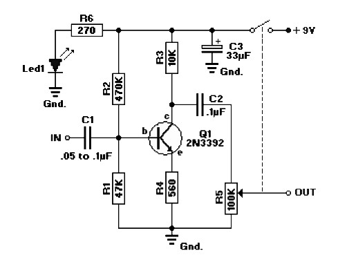 Parts list : R1 : 47K R2 : 470K R3 : 10K R4 : 560 R5 : 100K potmeter+switch Linear R6 : 270 C1 : Capacitor, .05-.1μF Ceramic, 50V C2 : Capacitor, 0.1μF Ceramic, 50V C3 : Capacitor, 33μF/25V Electrolytic Q1 : 2N3392 Transistor, NPN LED1 LED, red 276-033 Ultra-Bright