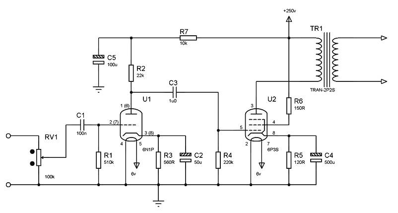 U1 – 6N1P (one half – the right channel, the other – left); U2 – 6P3S.