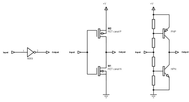The diagram shows the schematic of the center of one of the six internal gates is contained in the CD4069, which consists of two field-effect transistors. The diagram on the right represents a kind of equivalent to a conventional bipolar transistor. The four resistances of the two schemes have a very high value of several hundred Mega ohms.