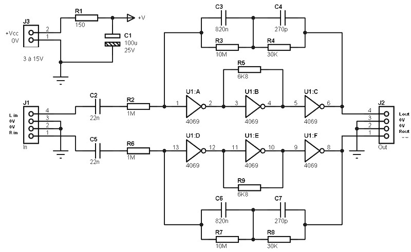 For low distortion, which is fixed by a maximum of 0.1%, the rate of reaction-cons must be at least 1000. With only one gate is a little too tight, and two is more than enough. But as it is entitled to a reverse phase (180 degrees) with each logic gate, the use of two gates leads to a rephasing of the output from the input. Which is not suitable for mounting against feedback. Therefore a third gate was added to operate a new phase inversion. The value given to the resistor R5 to left channel (and R9 to the right channel) is low for this reason: no need to have a high gain for the third driver.