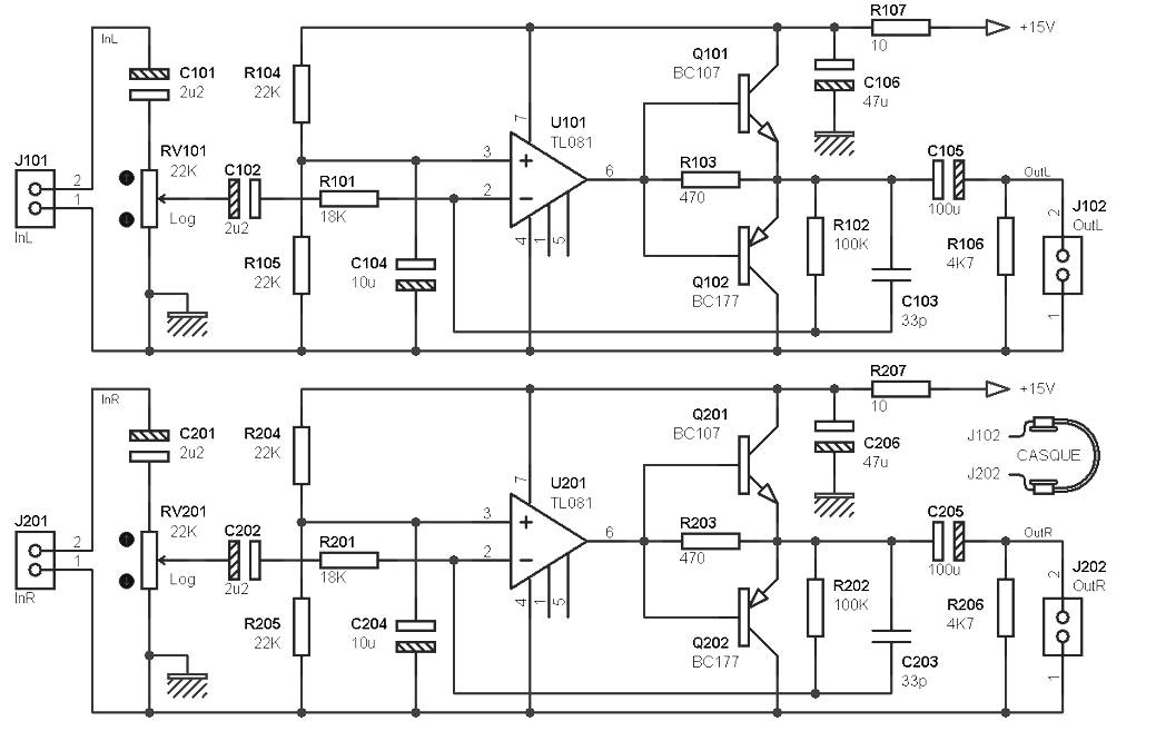 The total gain is determined by the ratio of resistors R102 / R101 for the left channel (top half of the diagram), and R202 / R201 for the right channel (lower half of the diagram), and is about 5 in this case (about 15 dB). Capacitors C103 and C203 may seem unnecessary to some, but mounting low gain can also oscillate, and these two capacitors limit the risk that happening.