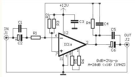 C4=1pF ceramic C5=10nF 100V C6=100uF 25V IC1=LM359N J1-2=BNC connector |